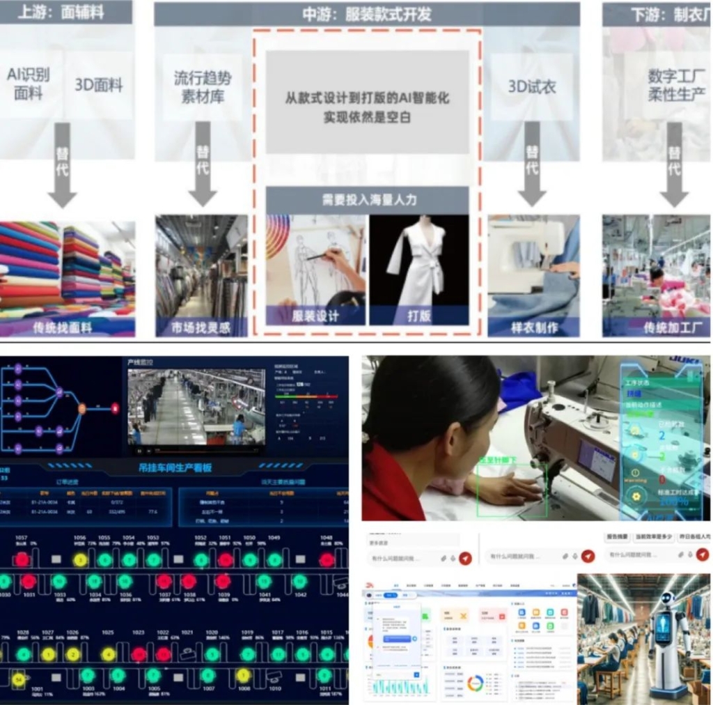服裝行業(yè)作為具有市場(chǎng)化程度高、中小微企業(yè)占比較大、勞動(dòng)密集型等特點(diǎn)的工業(yè)門類之一,近年來面臨著綜合成本高、市場(chǎng)競爭加劇、數(shù)字化智能化轉(zhuǎn)型亟待提升等挑戰(zhàn)。AI技術(shù)正在參與服裝設(shè)計(jì)、生產(chǎn)、供應(yīng)鏈、銷售全流程環(huán)節(jié),大致可以分為數(shù)字人分身、研發(fā)技術(shù)管理、計(jì)劃排產(chǎn)管理、設(shè)備物聯(lián)、智能生產(chǎn)管理、視覺質(zhì)量檢測(cè)管理決策五個(gè)領(lǐng)域。