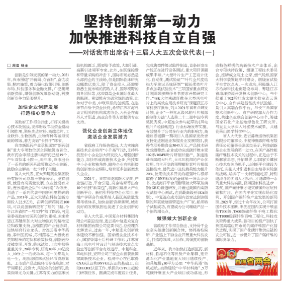 在大會(huì)期間,張國良董事長認(rèn)真聽取、討論、審議了省人民政府、省人大常委會(huì)、省檢察院、省高級(jí)人民法院,國民經(jīng)濟(jì)和社會(huì)發(fā)展以及財(cái)政預(yù)算等工作報(bào)告。針對(duì)當(dāng)前熱點(diǎn)問題,張國良董事長聚焦科技創(chuàng)新、綠色低碳、高質(zhì)量發(fā)展等問題,積極提出意見和建議。 在接受江蘇電視臺(tái)采訪時(shí),張國良董事長表示:“碳纖維是我們國家重要的新材料,下一步既要迅速地?cái)U(kuò)大生產(chǎn)規(guī)模,還要打造一個(gè)國家級(jí)的重點(diǎn)實(shí)驗(yàn)室”。