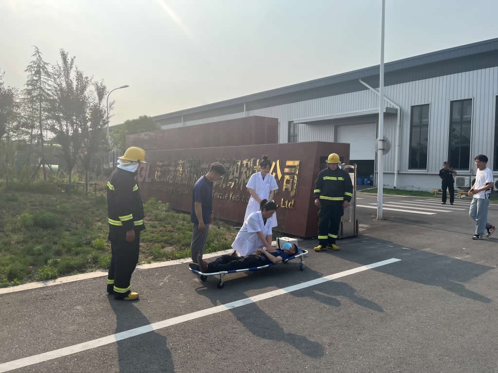 本次應(yīng)急救援演練共分搶險(xiǎn)救援組、警戒保衛(wèi)組、物資供應(yīng)組、醫(yī)療救護(hù)組等八個(gè)小組。當(dāng)鷹游生產(chǎn)車間高溫定型機(jī)箱體發(fā)生火情時(shí),相關(guān)人員第一時(shí)間剪斷進(jìn)入定型機(jī)的布匹,同時(shí)開啟蒸汽,關(guān)閉天然氣、關(guān)閉定型機(jī)的電源,清理定型機(jī)周圍的布匹,車間安全員迅速按照預(yù)案進(jìn)行滅火,廠內(nèi)專職消防員迅速整理好著裝,前往事故現(xiàn)場(chǎng)。專職消防隊(duì)迅速將被困人員轉(zhuǎn)移到安全區(qū)、醫(yī)護(hù)人員對(duì)暈厥人員進(jìn)行心肺復(fù)蘇緊急救治。